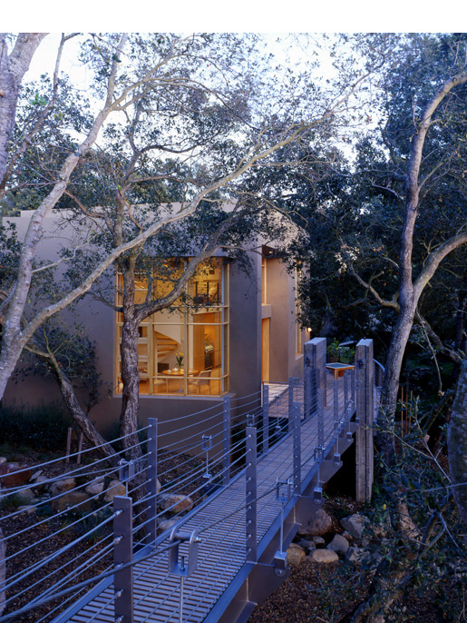 • Across a wooded dry creek bed, a steel suspension foot bridge links the infinity edged pool/spa terrace to the guest house – a private and elegant "tree house" with ocean/mountain views through the oaks and acacias.